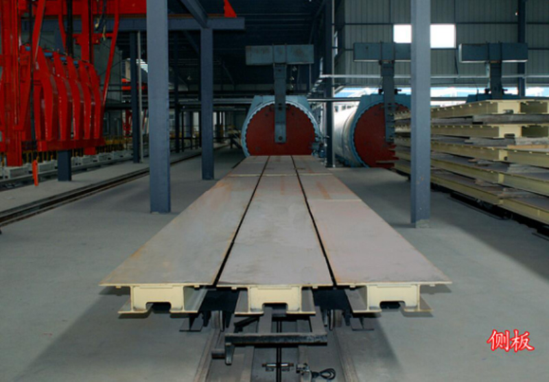 經(jīng)過翻轉吊具脫模后,側板承載加氣磚,切割進釜蒸養(yǎng)直至包裝工段。